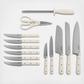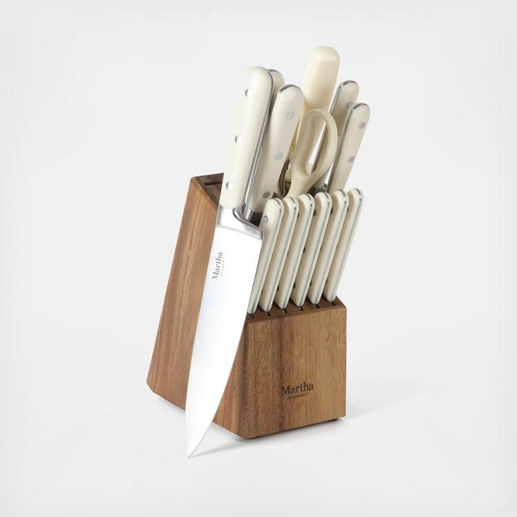 The Martha Stewart 14-Piece Stainless Steel Cutlery Set offers all food prep essentials for home cooks at any skill level. Made from forged stainless steel with full tang construction, each knife ensures precise cuts and smooth food release. Ergonomic, triple-riveted handles have comfortable and balanced grips, perfect for dicing, mincing, chopping, and more. Store knives in the acacia wood knife block safely when not in use.