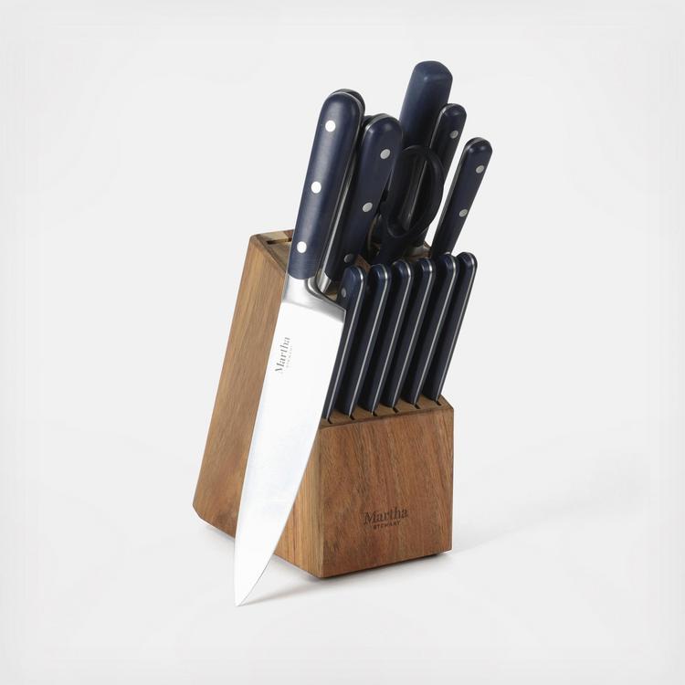 The Martha Stewart 14-Piece Stainless Steel Cutlery Set offers all food prep essentials for home cooks at any skill level. Made from forged stainless steel with full tang construction, each knife ensures precise cuts and smooth food release. Ergonomic, triple-riveted handles have comfortable and balanced grips, perfect for dicing, mincing, chopping, and more. Store knives in the acacia wood knife block safely when not in use.