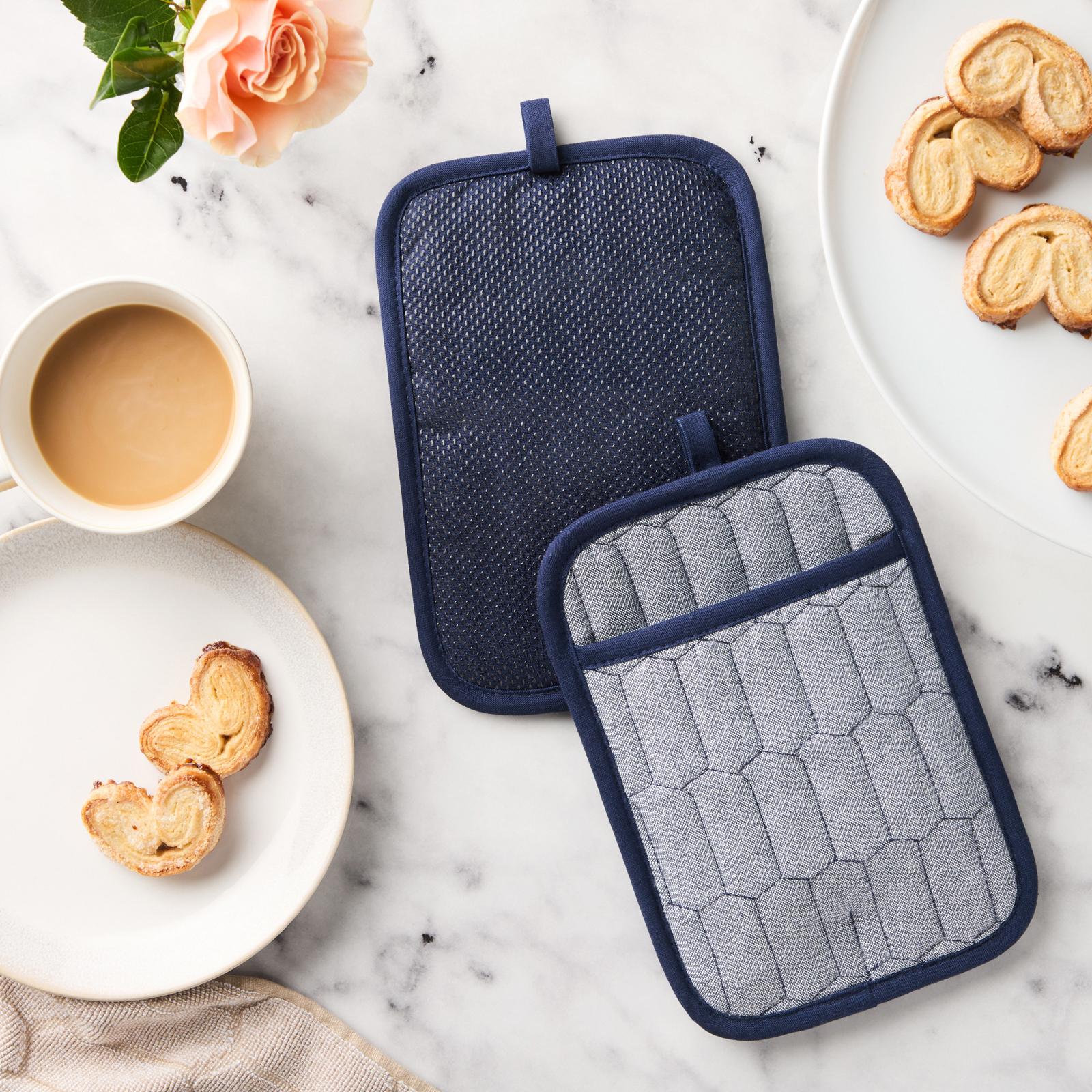 Refresh your kitchen essentials and decor with the Martha Stewart Honeycomb Chambray Textured Kitchen Collection. Whether you’re looking for kitchen towels, oven mitts, pot holders or table linens, this stylish collection will bring style and texture to your home. The Martha Stewart Honeycomb Quilted Chambray Pot Holder Set includes two decorative and functional pot holders. These heat resistant pot holders are durable, provide a flexible non-slip silicone grip, and protect your hands and surfaces while cooking or baking your favorite Martha Stewart recipes. Use while hosting and serving guests as a trivet or as an everyday kitchen essential while cooking. Made of machine washable Cotton, these oven mitts are easy to clean, dry and store with decorative hang loop.