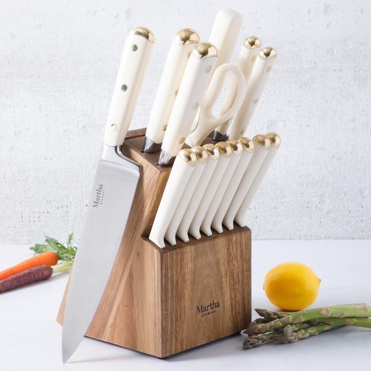 Following the lead of Martha's best-selling Lockton cookware collection, this 16-piece Stainless Steel Cutlery Set with Acacia Wood Block continues to carry the collection's signature gold accent through each knife's stainless steel butt and rivet. The Lockton Knife Set features heavy-duty and full-tang knives, forged from high-carbon stainless steel, designed to resist rust and retain exceptional sharpness. Each ergonomic handle is secured by stainless steel rivets for a strong and secure grip. The knives fit nicely in the smooth-grained acacia wood block to offer a beautiful yet compact way to store and display the knifes on your kitchen countertop. Use a soft, damp cloth to clean the knife block. Following the lead of Martha's best-sellling Lockton cookware collection, this stainless steel knife set is available in different shades with the signature gold accent for a match made in colorway heaven.