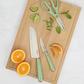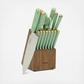 Following the lead of Martha's best-selling Lockton cookware collection, this 16-piece Stainless Steel Cutlery Set with Acacia Wood Block continues to carry the collection's signature gold accent through each knife's stainless steel butt and rivet. The Lockton Knife Set features heavy-duty and full-tang knives, forged from high-carbon stainless steel, designed to resist rust and retain exceptional sharpness. Each ergonomic handle is secured by stainless steel rivets for a strong and secure grip. The knives fit nicely in the smooth-grained acacia wood block to offer a beautiful yet compact way to store and display the knifes on your kitchen countertop. Use a soft, damp cloth to clean the knife block. Following the lead of Martha's best-sellling Lockton cookware collection, this stainless steel knife set is available in different shades with the signature gold accent for a match made in colorway heaven.