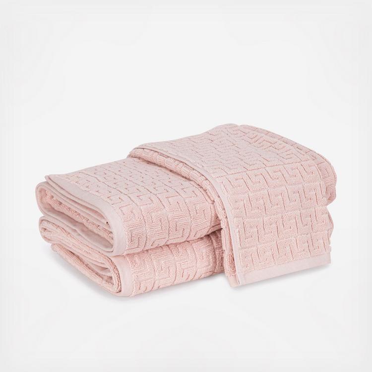 This sculpted towel style with a Greek key motif is based on a Schumacher fabric and adds an air of subtle elegance to any bathroom. Crafted in 100% cotton, it has a graceful, mid-weight feel to it and comes in a series of sublime hues.