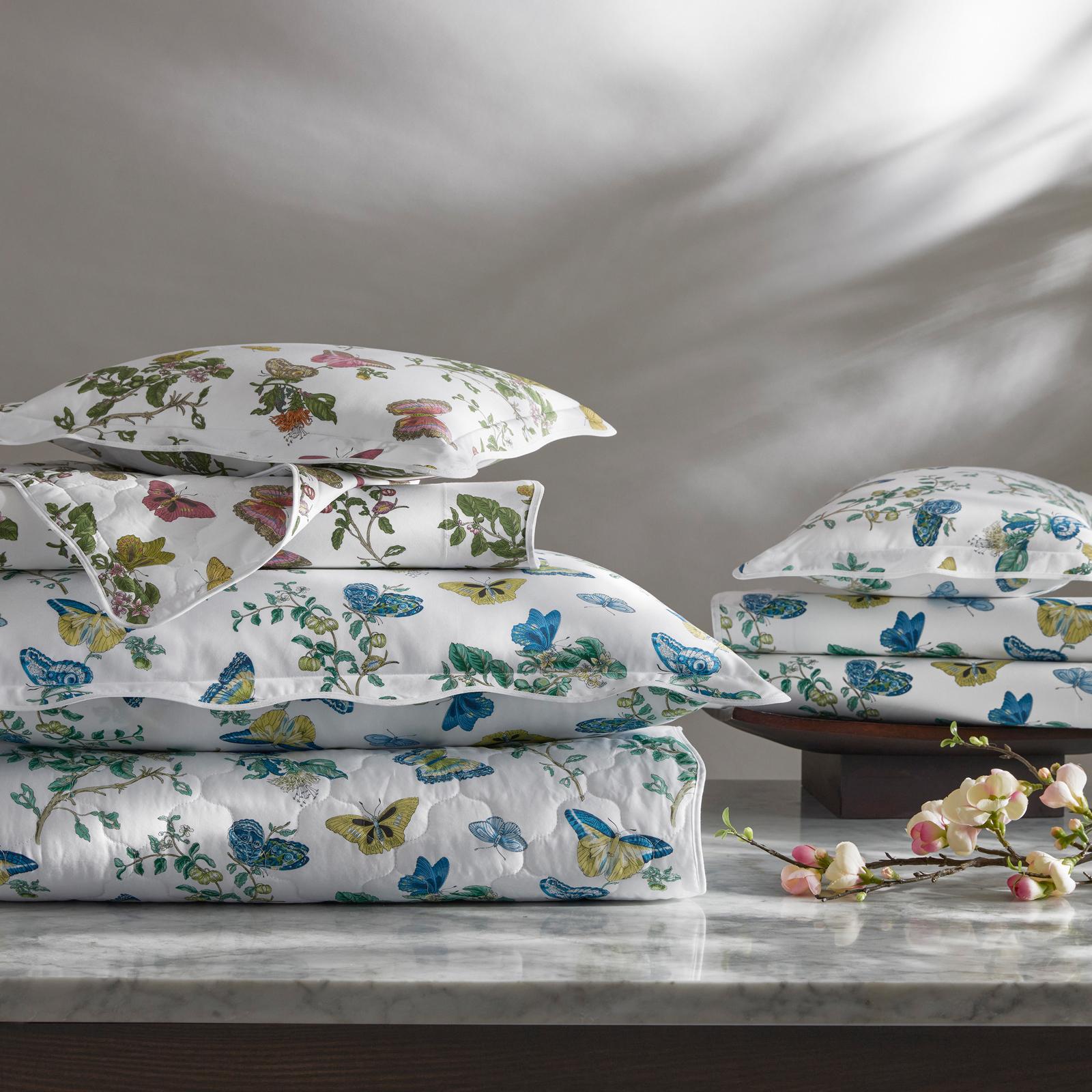 Baudin Butterfly is a delightful Matouk Schumacher print with an enchanting mix of butterfly and botanical motifs. It’s elegantly finished with a scalloped trim, adding an extra note of refinement. Pair Matouk's Baudin Butterfly bed linens with the matching Baudin Butterfly Fitted Sheet. Luca 500 thread count 100% Egyptian cotton percale.