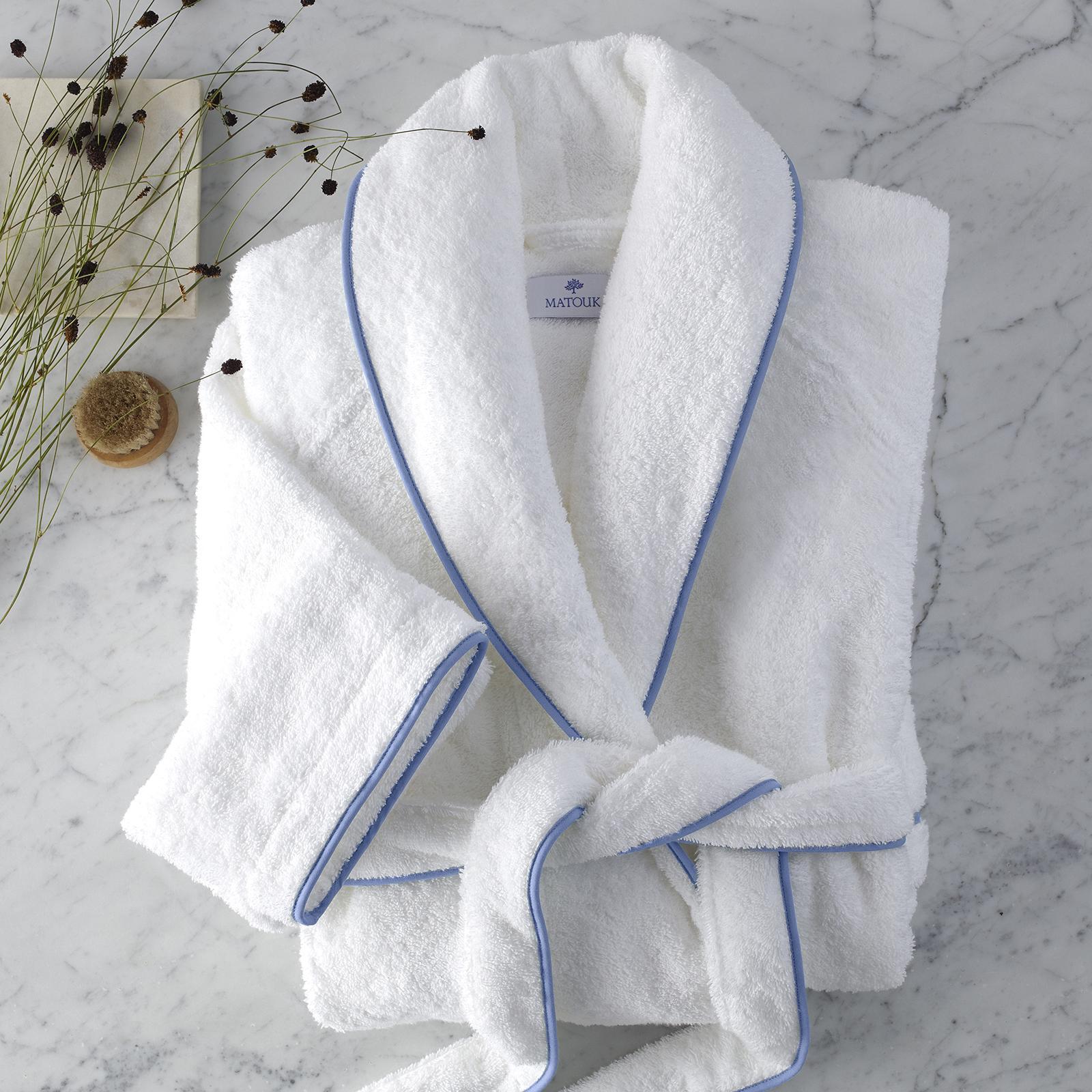 Like the cairo towel collection, this robe's simple design is simply beautiful. Long-staple cotton terry is neatly trimmed with bias-tape piping.