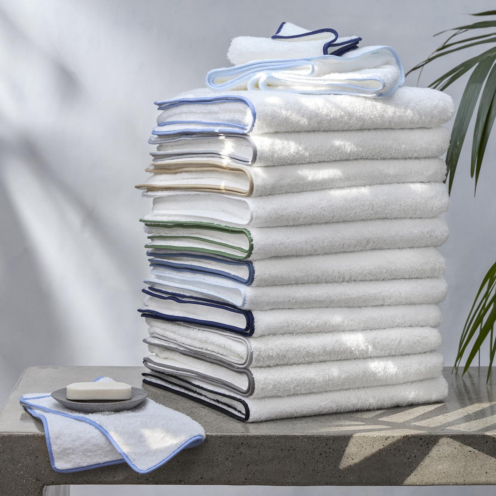 Soft, plush and absorbent, very fine, long staple cotton with a contrasting color piped trim. 625 GSM.