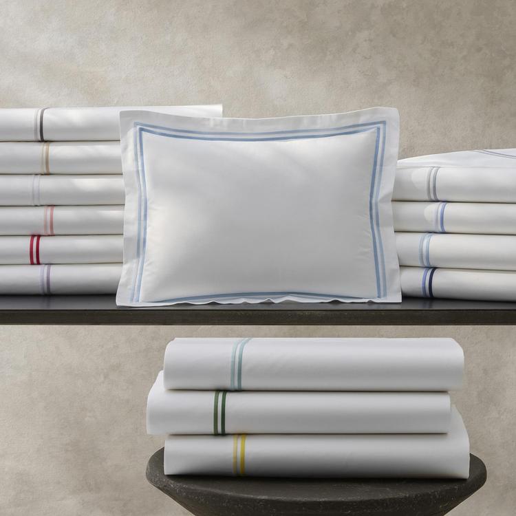 350 thread count 100% long staple cotton percale. Essex brings two smart lines of satin stitch embroidery to this Sierra sheeting, in long-staple cotton percale. With tonal colors and crisp design, Essex adds a smart look to any bedroom.