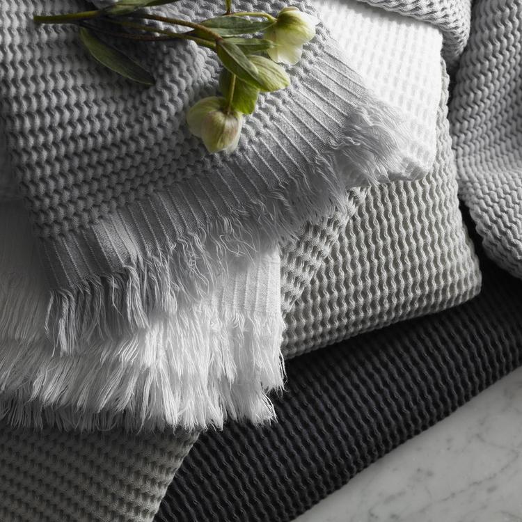 Kiran is a unique waffle towel with luxuriant suppleness and thirsty texture. Woven in Turkey, Kiran features a delicate barred border with fringe for a special finishing touch.