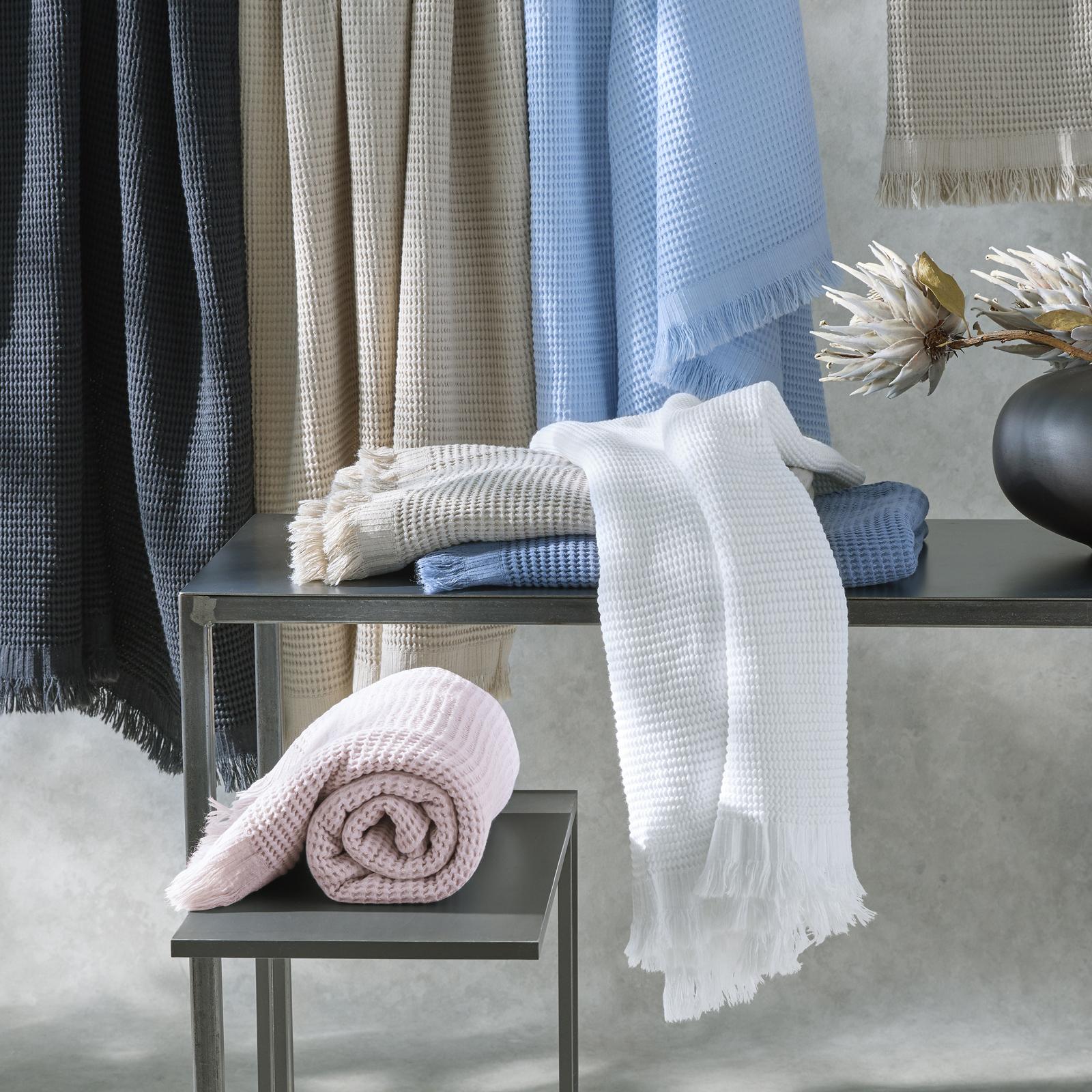 Kiran is a unique waffle towel with luxuriant suppleness and thirsty texture. Woven in Turkey, Kiran features a delicate barred border with fringe for a special finishing touch.