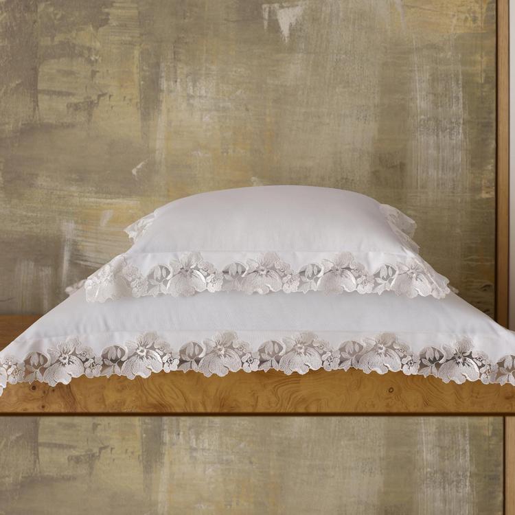 Hand–cut Swiss lace and opulent Gatsby percale combine in this extraordinary, couture style 1000 thread count Egyptian cotton percale woven in Italy.