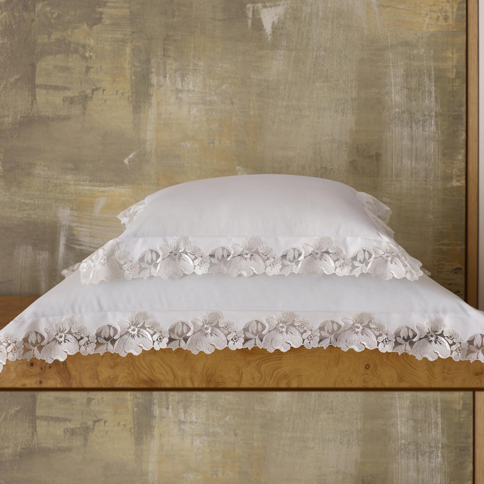Hand–cut Swiss lace and opulent Gatsby percale combine in this extraordinary, couture style 1000 thread count Egyptian cotton percale woven in Italy.