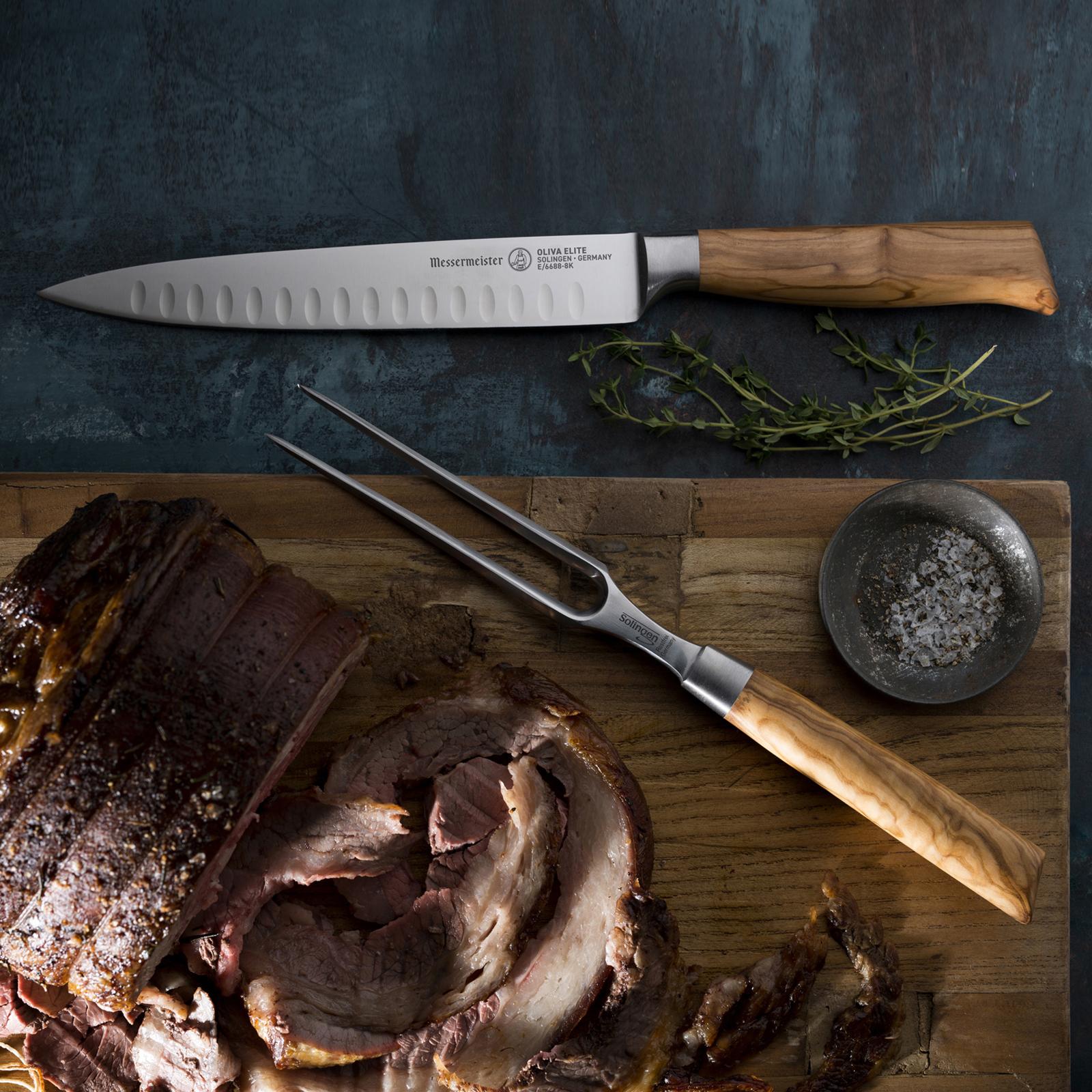 Oliva Elite boasts an exquisite natural, Italian Olive Wood handle attached to a hammer forged blade. The highly figured, beautiful golden brown handle provides a secure ergonomic grip with an unsurpassed balance. The blade, bolster and tang are one-piece, hot-drop hammer forged from a single billet of the finest German steel alloy. Oliva Elite knives are handcrafted one at a time, using the same techniques that have been the hallmark of fine German made cutlery for hundreds of years. Oliva Elite knives are of heirloom quality and ideal for everyday use in the kitchen. This set makes carving a roast a pleasure. This duo is a must in every kitchen. Each handle in the Oliva Elite line is unique and made from beautiful, Italian olive wood. No two handles are the identical, making these knives truly boutique and one-of-a-kind.