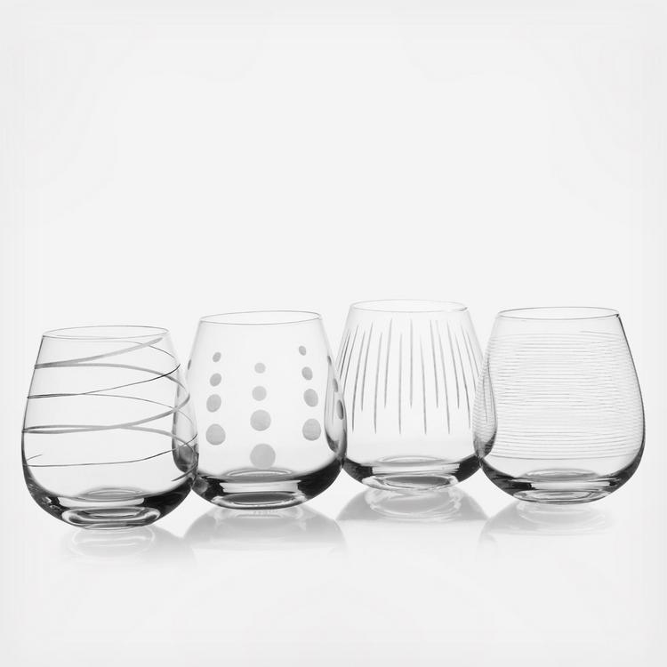 The fun and whimsical designs of the Cheers collection set a festive mood at any gathering. Each glass in the set of 4 is precision-etched with a different yet coordinating design. The dots, lines, and swirls are also distinctive, so each of your guests can easily identify their glass. Dishwasher safe - top rack. Set of 4 stemless wine glasses, each holds 15 ounces.