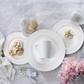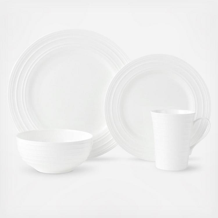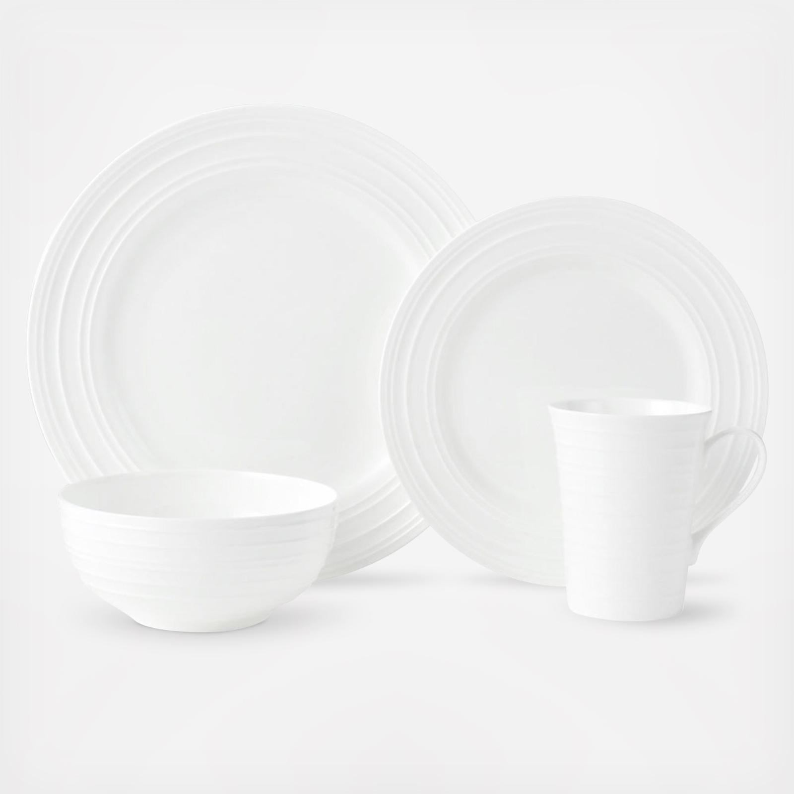 Ciara dinnerware features embossed whimsical swirling lines on a crisp white body creating a striking statement. Constructed of bone china and chip resistant, this 16-piece dinnerware set serves for four.