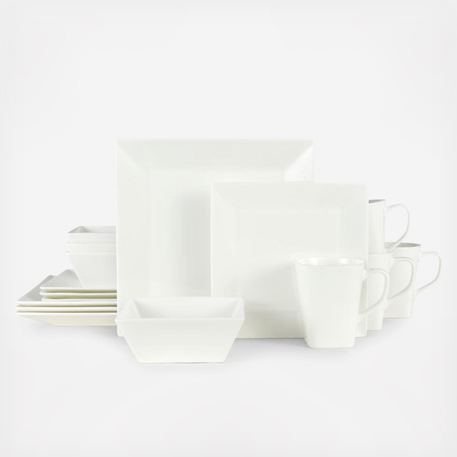 Delray Square 16 Piece Dinnerware Set features an embossed basketweave design on a coupe shaped body.