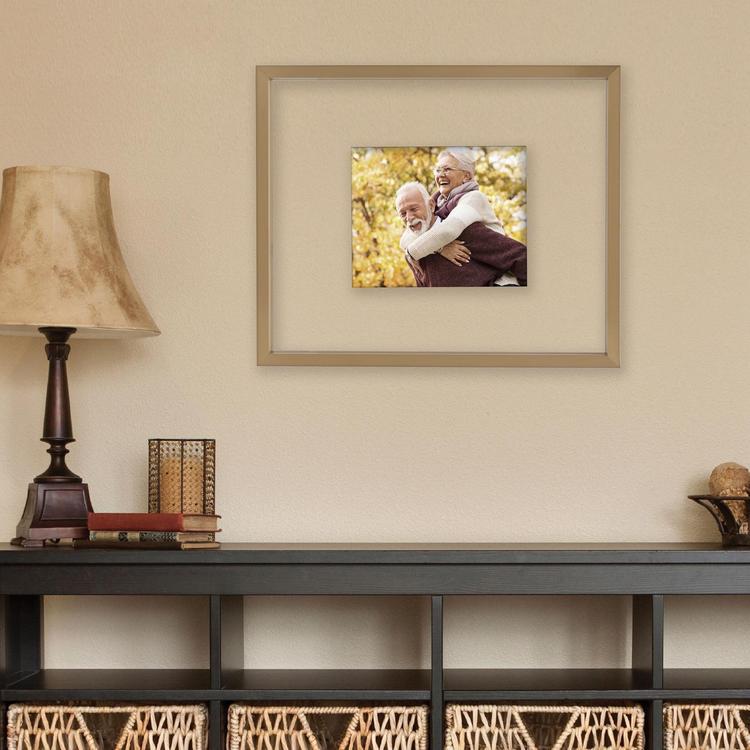 Highlight one 8 x 10 inch or 11 x 14 inch photo of a cherished memory with this Mikasa Portrait Floating Frame. Designed with eye-catching elegance, the gorgeous champagne edges add a stunning look to your photo display. The clear panels create an alluring, floating effect. This contemporary frame enhances the decor in any room in your home. Simply use the d-ring hangers to hang vertically or horizontally on any wall. Mikasa Floating Portrait Frame, 17x21 Inch frame to display one 8x10 photo, vertical or horizontal display.