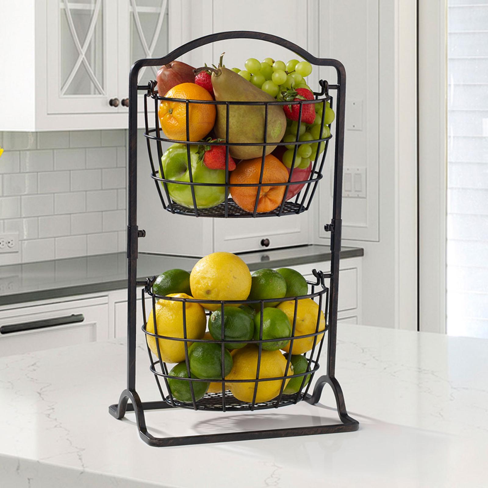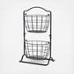 From Gourmet Basics by Mikasa Collection. This 2 Tier Harbor Hanging Basket features a beautiful traditional design and allows you to maximize space in any room of your home. This 2 tier basket is great for storing or displaying food or other items. Crafted from wrought iron for long-lasting beauty even under rigorous use. Wipe clean with damp cloth. Measures 17.5 in. high x 6.75 in. wide x 10 in. long.