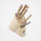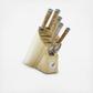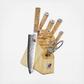 Miyabi Birchwood knives are made from the finest materials delivering high-performance. The blade consists of SG2 micro-carbide steel, one of the hardest high-performing steels on the market creating a 63 Rockwell Hardness. The Damascus clad features 50 layers on each side of the knife blade totaling 101-layers including the SG2 steel core. The blades are ice-hardened for enhanced hardness, flexibility and are corrosion resistant. Each knife is hand-finished in the Honbazuke 3-step method, creating a beautiful mirror polished edge. A Katana edge is featured on each knife blade, reminiscent of the legendary Japanese swords, known for superb craftsmanship. The blade is adorned with a Birchwood traditional D-shaped style handle with an intricate mosaic pin, accented with two red spacers and engraved end cap.