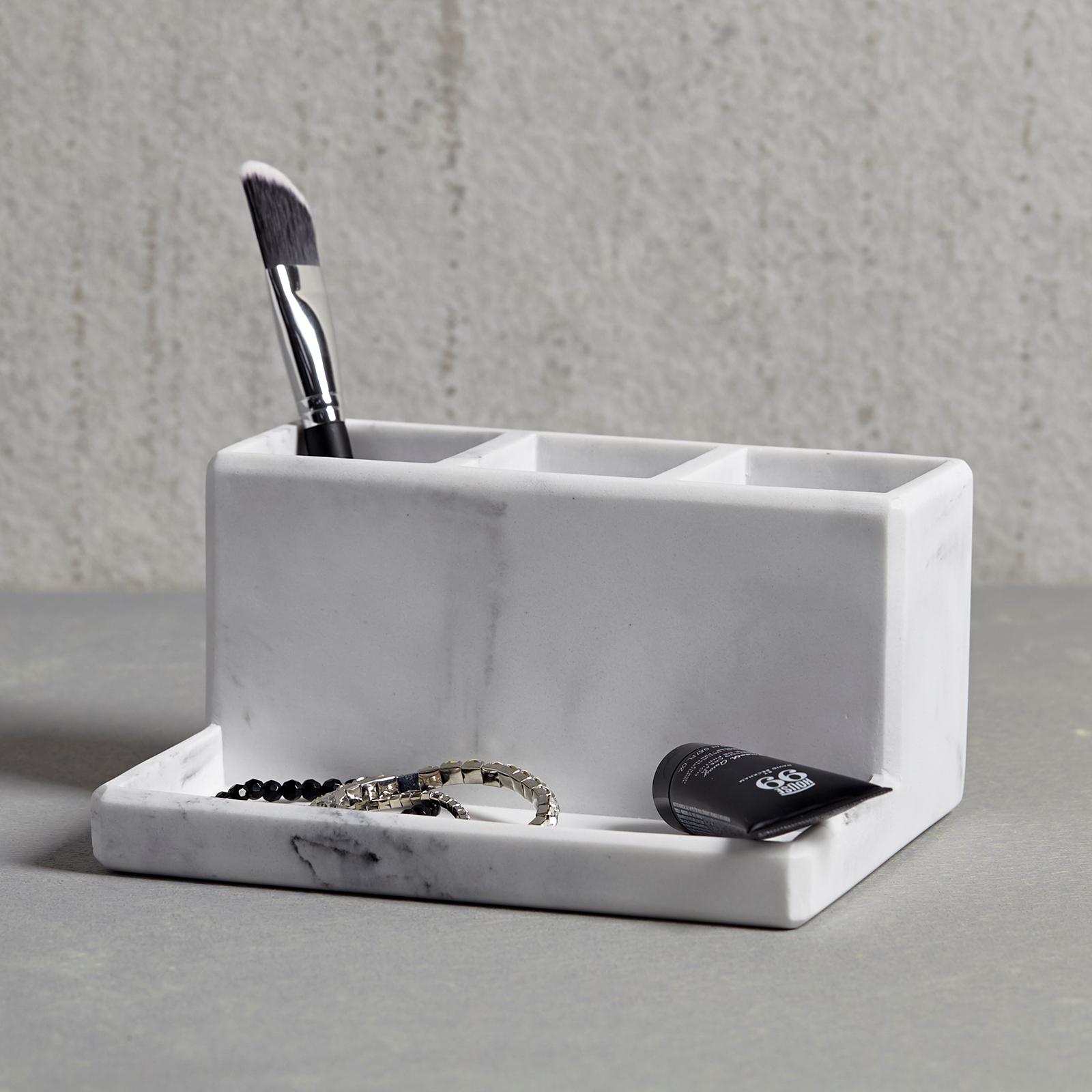 Revolutionize your organization with our Resin Michaelangelo 3-Part Organizer, a versatile solution beyond the bathroom. Crafted for style and durability, this organizer is ideal for makeup, nightstand essentials, and desk supplies. The chic resin design adds elegance to any space, while its practicality ensures seamless organization, transforming not just your bathroom counter but also other key areas in your daily routine.