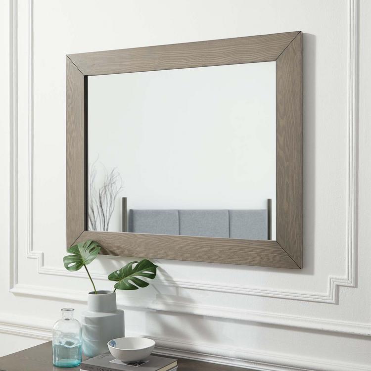 Reimagine your bedroom space with the Merritt Mirror. Merging mid-century style with contemporary modern allure, this rectangular mirror is complete with a clean-lined design with beautiful wood grain detail. . A centerpiece in any bedroom space, living room, entryway, hallway, or bathroom, this mirror features a thick frame crafted with durable MDF and wood veneer. The Merritt Mirror is a versatile piece that can be used as part of the Merritt Bedroom Collection or as a stand-alone piece.