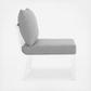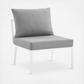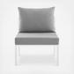 Refresh your outdoor decor with the Riverside Outdoor Patio Aluminum Armless Chair. Defined by a crisp, coastal style, this installment of the Riverside outdoor sectional sofa furniture collection features an open slatted back design, angled back legs, and plush 4" thick all-weather UV-resistant fabric cushions. Solidly constructed with a powder-coated aluminum frame, the Riverside armless outdoor chair will enhance the look of your patio, backyard, balcony, porch, deck, or poolside area. Includes foot caps. Chair Weight Capacity: 300 lbs