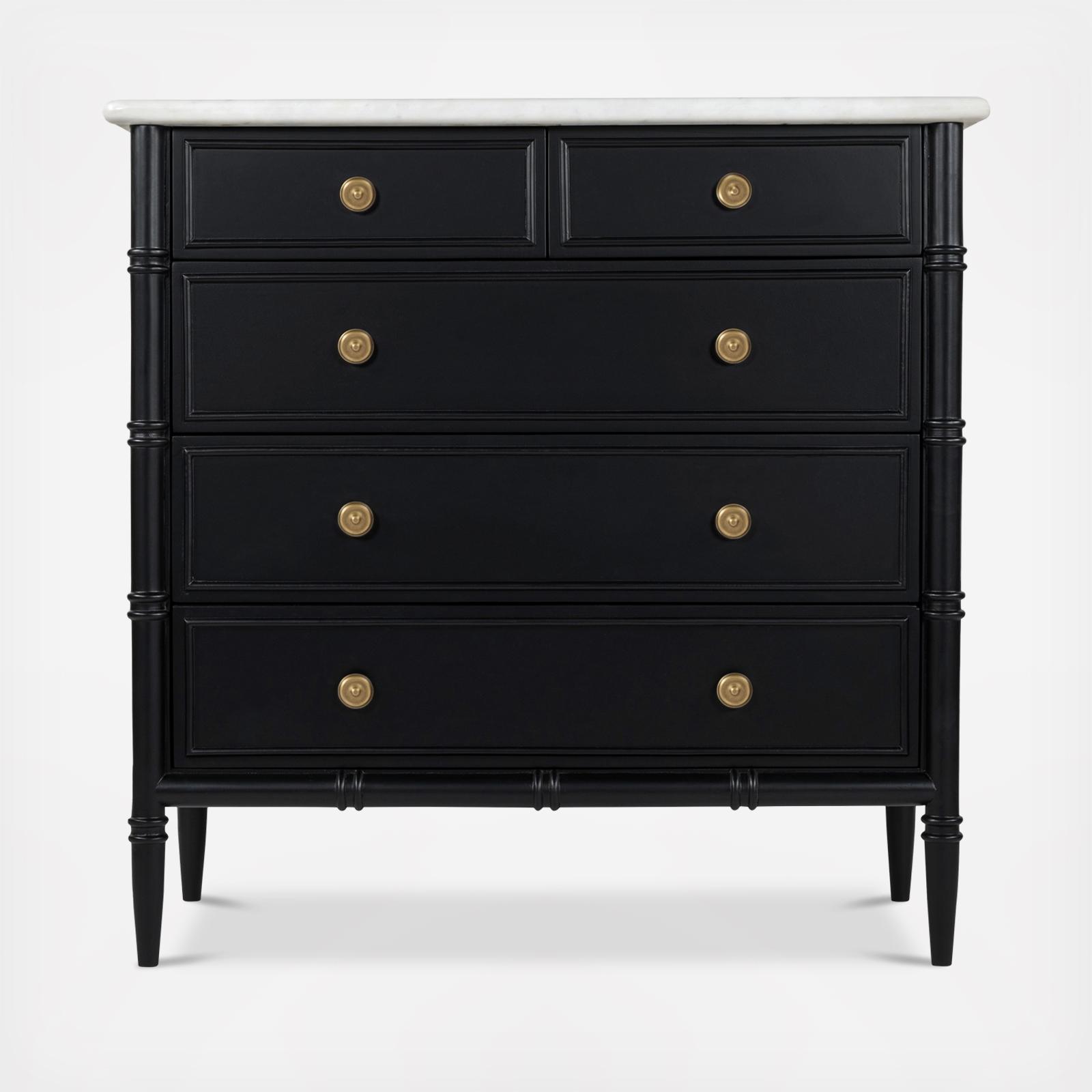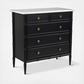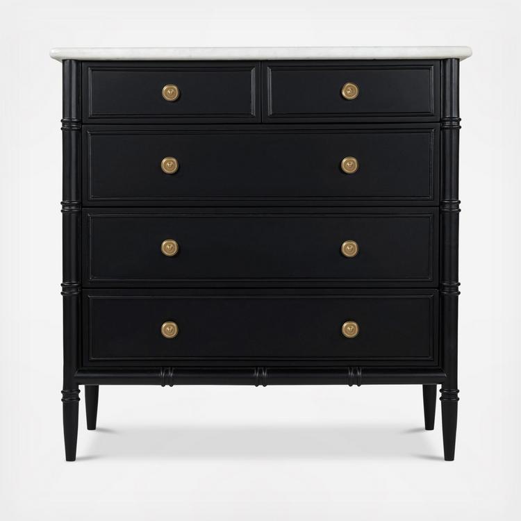 Inspired by the everyday grace of Provence style, the Eleanor 5-drawer chest showcases a classically graceful profile with distinctive turned details. Crafted from Mango wood, this piece is crowned with an expressive marble top and finished with solid antique finished brass finish handles, adding a touch of timeless sophistication and natural beauty.
