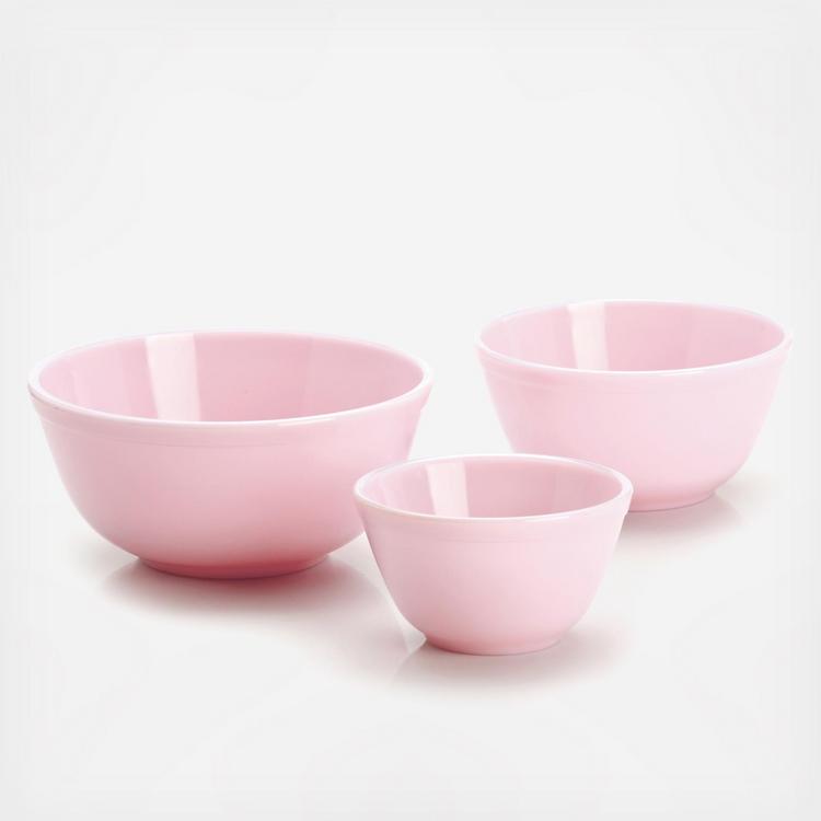 This 3-Piece Glass Mixing Bowl Set features designs and colors that will add a lovely retro flair to your kitchen! Proudly handmade in the USA, Mosser glass bowls are perfect for nesting in your cabinet, and won't take up extra space.