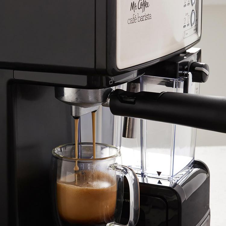 Create delicious coffeehouse-style drinks at home with the Mr. Coffee Café Barista Espresso Maker. This semi-automatic 3-in-1 coffee maker lets you enjoy bold espressos, rich cappuccinos, and decadent lattes with a simple touch, saving you the time and expense of buying drinks in a café. Simply pick a single shot or double shot filter, select your grounds, fill the milk reservoir, and choose your favorite type of brew. The Café Barista espresso coffee maker brews espresso with a 15-bar pump system and automatically froths milk into cappuccino and latte selections—no barista know-how needed. A recipe book is included to help you create a variety of delicious coffee drinks, including Espresso Martinis, Raspberry Cappuccinos, and Choco-Nutty Lattes.