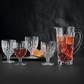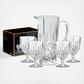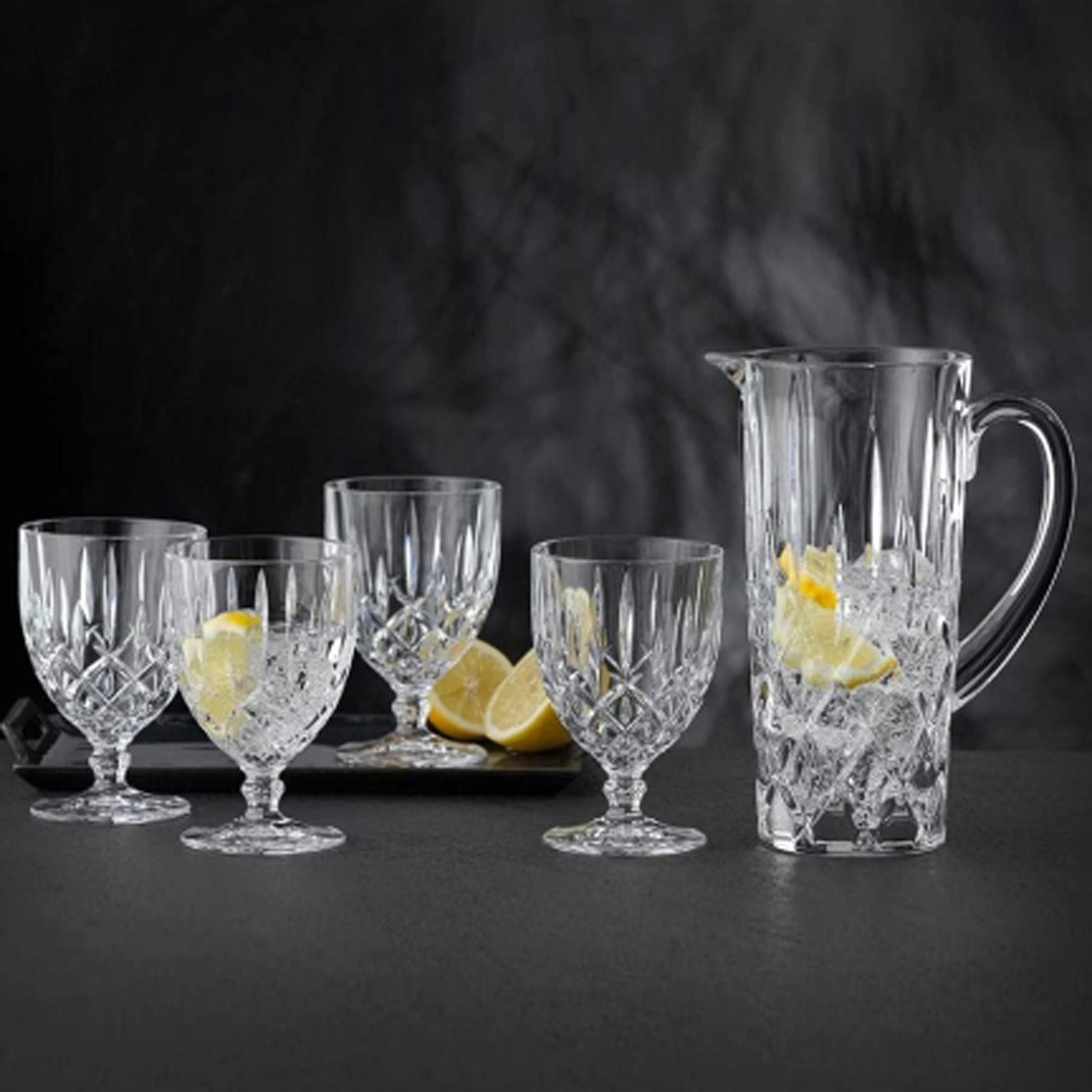 This versatile Noblesse 5 Piece Pitcher and Goblet set is a stylish and luxurious way to serve any type of beverage. The pitcher features a drip-free spout and handle for safe serving and easy pouring. The coordinating 12 ounce goblets are generously sized for any beverage with plenty of ice. The classic design cut into the crystal, gives the set of four glasses a distinctive look and extra sparkle. Coordinates with other drinkware and barware in the Noblesse collection.