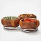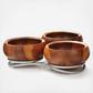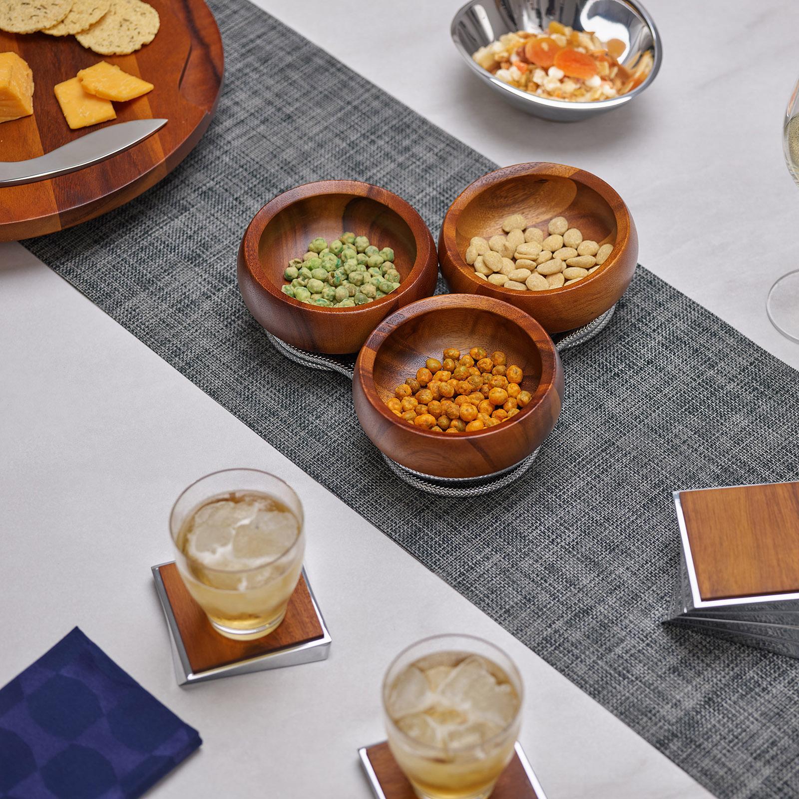 A polished and playful way to keep the coffee table or dinner table looking neat. The Braid Condiment Server features a bright braid arranged in a free-spirited series of coils to form a home base for a trio of stunning wood bowls, gently organizing and elevating them. The gleaming chrome accentuates the rich grain of the acacia wood, and when the trio is filled with colorful condiments -