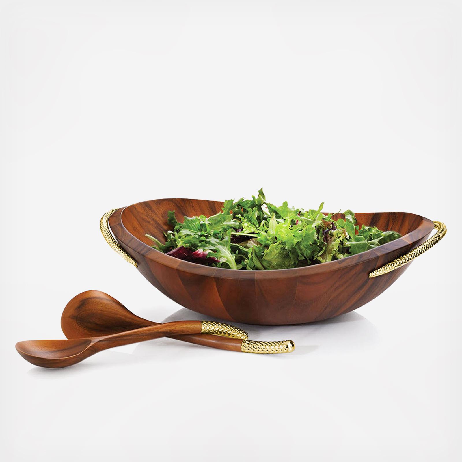 Handcrafted from rich acacia wood and accented with gleaming golden braid handles, this salad bowl and matching servers make every meal feel special. A timeless blend of warmth and shine, perfect for everyday dining or entertaining.