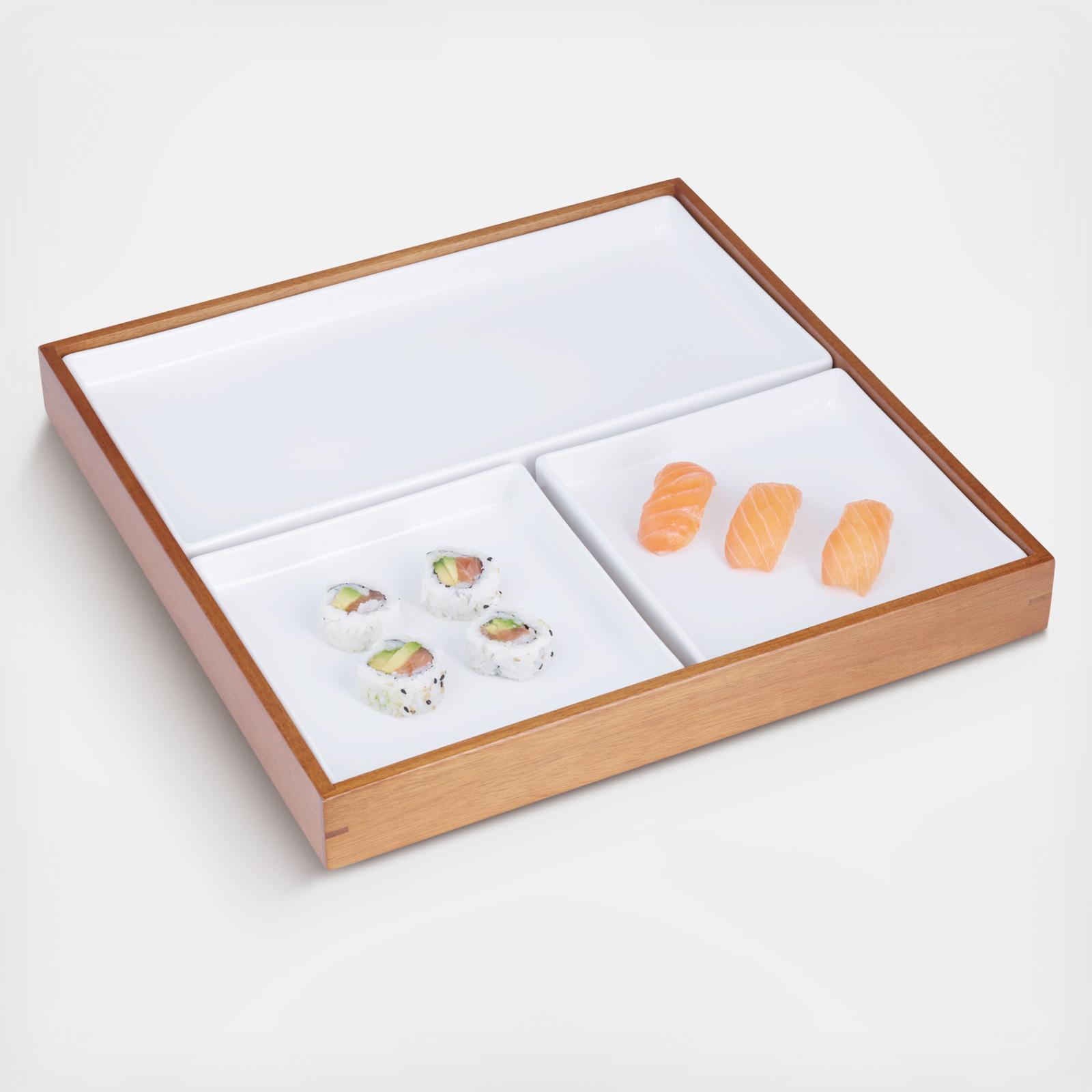 An oversized and sophisticated take on a classic Japanese lunchtime favorite. The Duets Bento Box offers a mixed material style, marrying warm acacia wood and cool, porcelain. The box features three compartments, keeping food organized and separate, each made of porcelain.