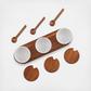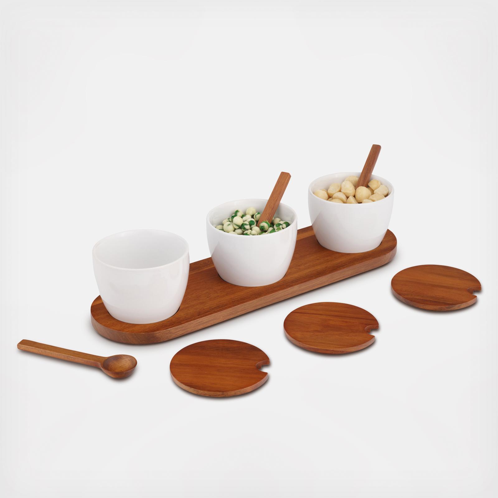 Perfect for serving dipping sauces, nuts, dried fruits, and more. Elegantly showcasing their mixed material design, the Duets Triple Condiment Server with Lids & Spoons include cool, porcelain bowls with a warm acacia wood base, complete with serving spoons and lids.