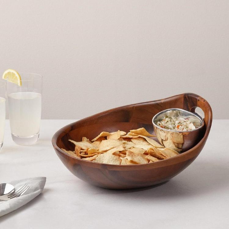 Portables is designed for modern day life where home is more than a place to live, it is a place with endless spaces to dine and entertain. The Portables Chip & Dip offers visual intrigue on the table with asymmetrical sides. The wooden base is multi-functional and features an open handle to facilitate easy serving and transporting. Its Alloy dip bowl is removable and can be heated or chilled prior to serving.