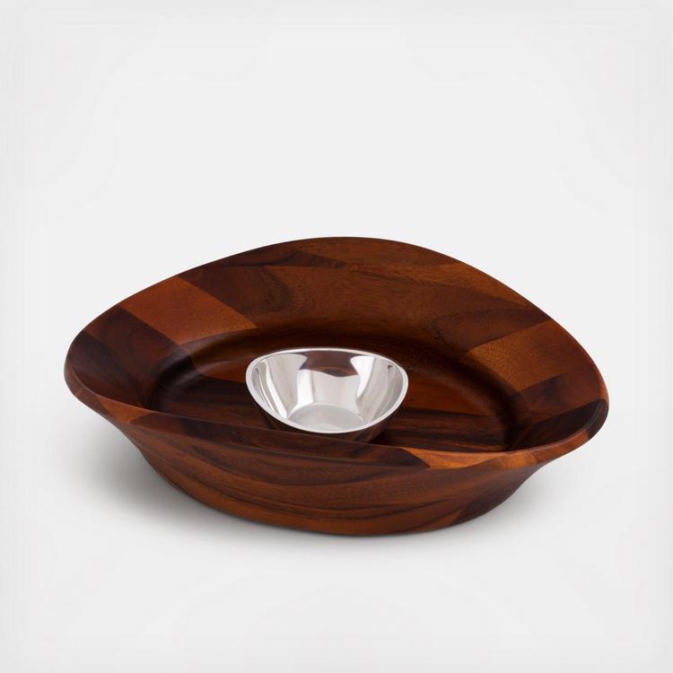 The smooth rise and fall of the Ripple Chip and Dip’s organic shape mimic the ripple of the tide as its sides extend to create a deep, oval well to store chips or vegetables. Nestled in the center, a removable alloy dip bowl is waiting to be filled with homemade dip. Designed by Alvaro Uribe.