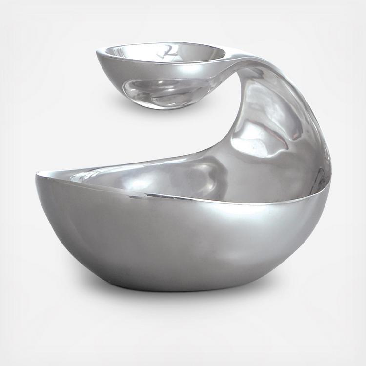 Ideal for small surfaces, the Scoop Server Mini is a functional and modern twist on the classic chip and dip. Use it for nuts and olives, dips and chips, chocolate medleys, and more. Or fill the bottom with stones and place a tea light in the upper bowl for an elegant non-mealtime look.