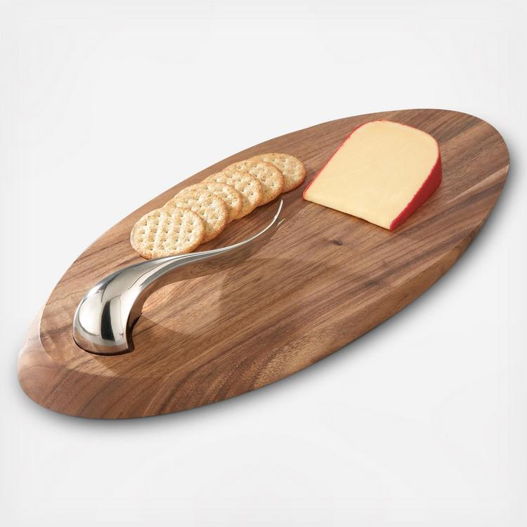 Step up your style quotient for your next wine and cheese night. The wooden cutting board is a definite classic standby, contrasted by the ultra-svelte and modern stainless steel knife. Like a great pairing of wine and cheese, these two elements are perfectly complementary - and at their best when they're together. Our set makes an especially thoughtful hostess or wedding gift.