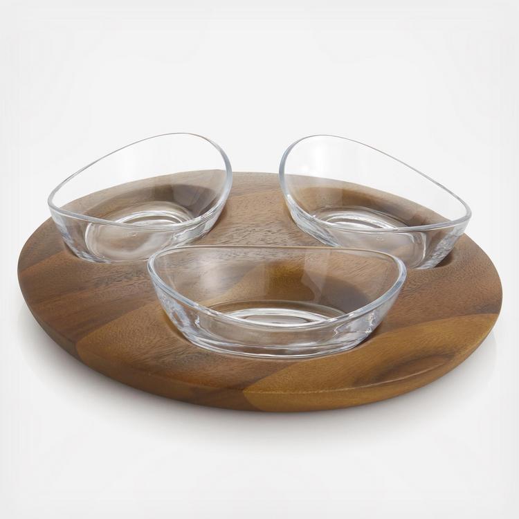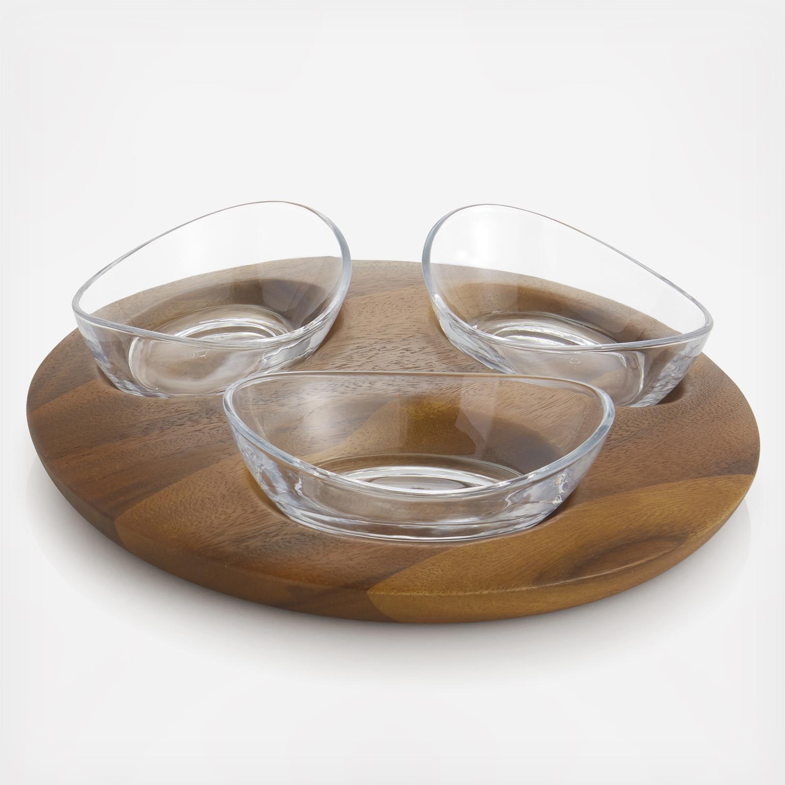 Bar snacks never looked so good. Perfect for serving nuts, olives and more, the Vie Triple Snack Set combines a round piece of rich Acacia Wood with three glass serving vessels for a functional yet stylish snack set. When you’re done, the glass bowls are dishwasher safe for easy clean up.