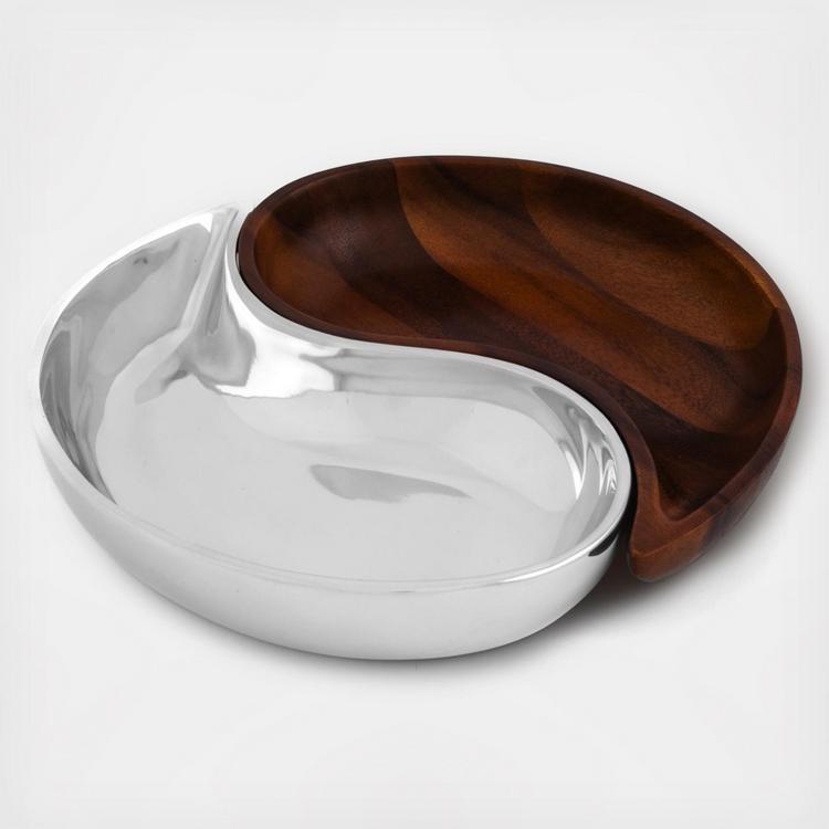 The Yin Yang Divided Server Set is split into an acacia wood section and their alloy section that rest beautifully together to form the sign yin yang. Each serving piece can accommodate nuts, candies, snacks, olives and other foods. Designed by Keeley Traae.