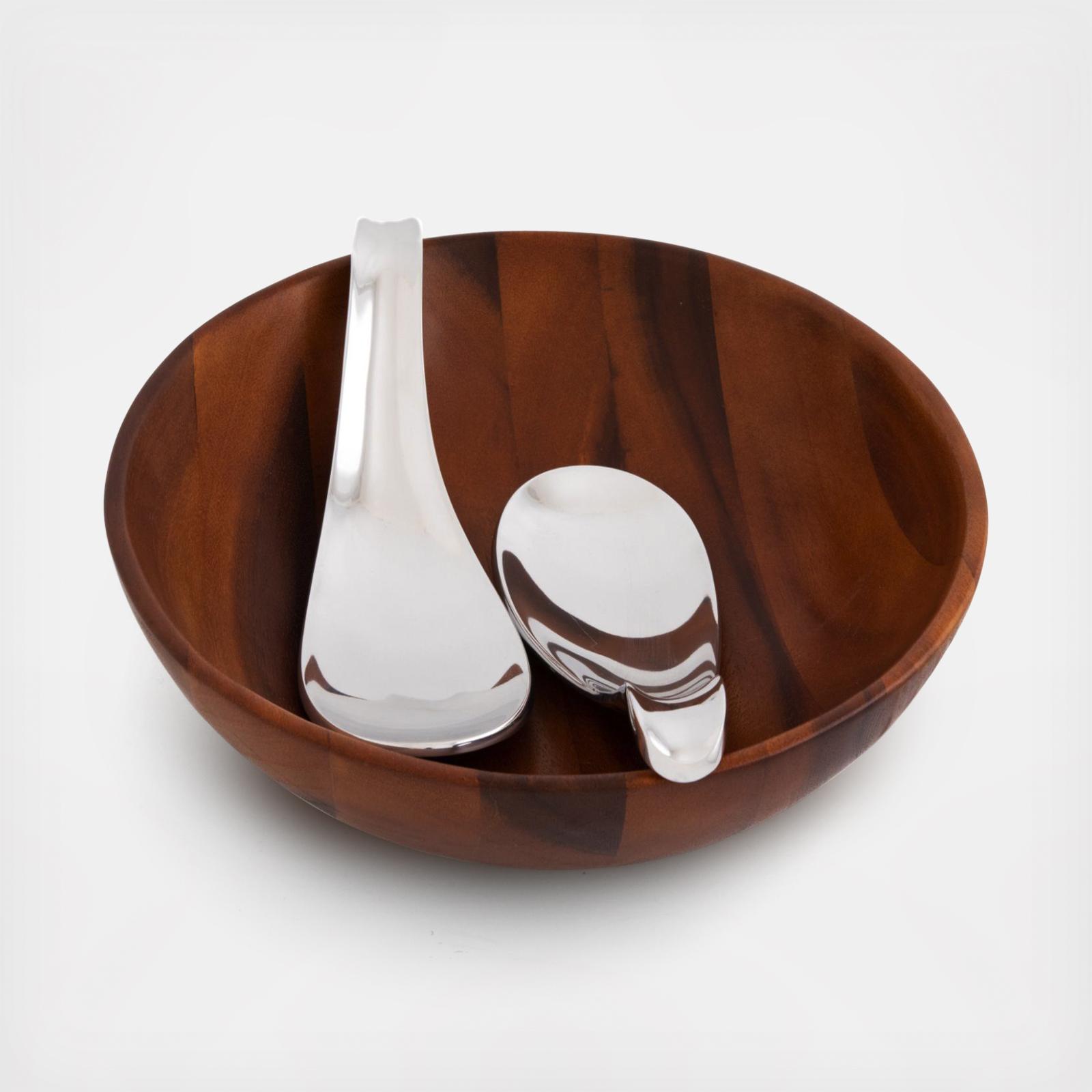 The Yin Yang Salad Bowl with Servers is an oblong bowl that is perfect for serving salads of all kinds. This set includes servers made from their alloy that come together harmoniously at the bottom of the bowl. Designed by Keeley Traae.