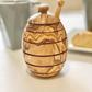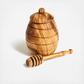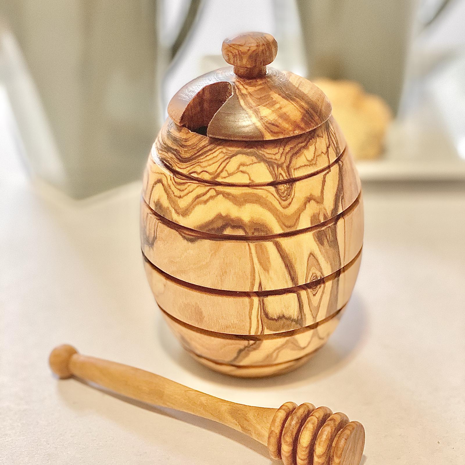 This cute Honey Jar with Dipper is a perfect accessory for storing your favorite honey. There are no chemicals or sealants on the wood. They are all natural and coated with only olive oil. Olive wood is dense and durable for everyday use. It is also nonporous so germs and odors are not retained. All products are made from a single piece of wood—they are seamless and no two pieces are alike.