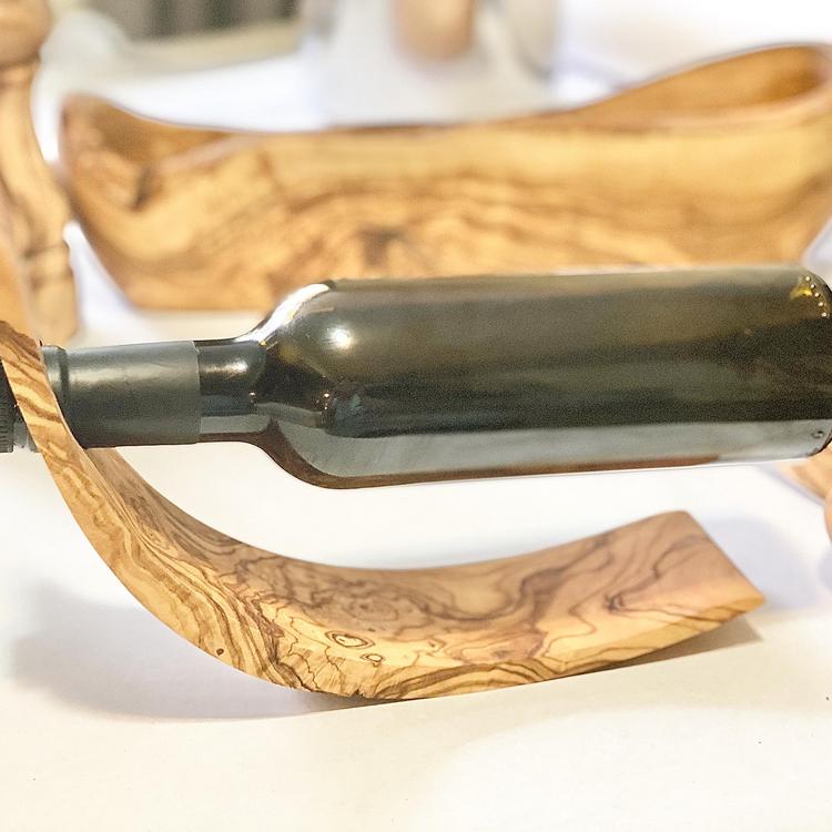 This unique bottle holder is a great conversation starter. There are no chemicals or sealants on the wood. They are all natural and coated with only olive oil. Olive wood is dense and durable for everyday use. It is also nonporous so germs and odors are not retained. All products are made from a single piece of wood—they are seamless and no two pieces are alike.