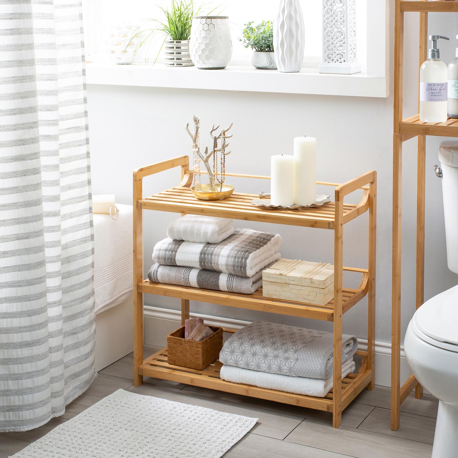 Create and maximize space with their double wide 3 tier shelf. The freestanding shelf allows you to place anywhere within in your home. The shelving is great for storing towels, toiletries, toilet paper and for displaying decor. The antimicrobial material makes this shelving unit durable and long lasting. Made of carbonized bamboo this shelf is natural and eco-friendly, a great addition to your home!