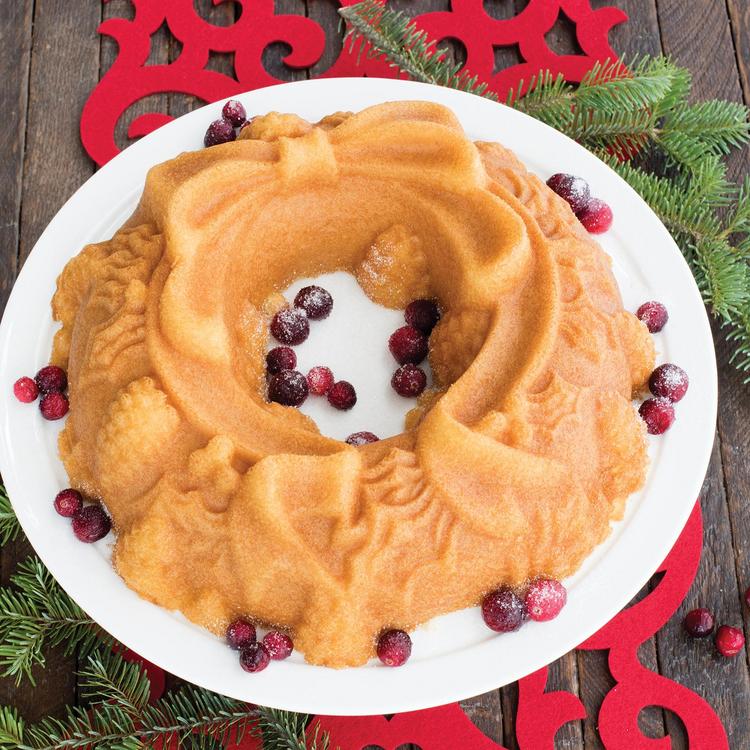 Create a beautiful centerpiece or holiday treat for your next festive gathering. The holiday wreath cake pan creates a wreath cake sculpted with pine cones, holly leaves, berries and ribbon. Original Cast Aluminum Bakeware provides fine details and superior baking performance. Distinctive premium nonstick interiors allow for quick release and easy cleanup. Heat reflective silver platinum exteriors ensure uniform browning. 9 cup capacity. Limited Lifetime Warranty. Proudly made in the USA.