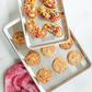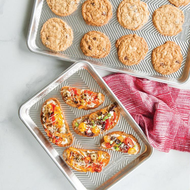 The embossed grid pattern enhances the look and performance of these hugely popular baking pans. The exclusive prism grid adds durability and provides easy release while also improving air flow for uniform crisping. Natural aluminum affords the best possible heat dispersion to create perfectly browned baked goods every time. A super starter set with one quarter sheet and one half sheet. The pieces nest for storing.