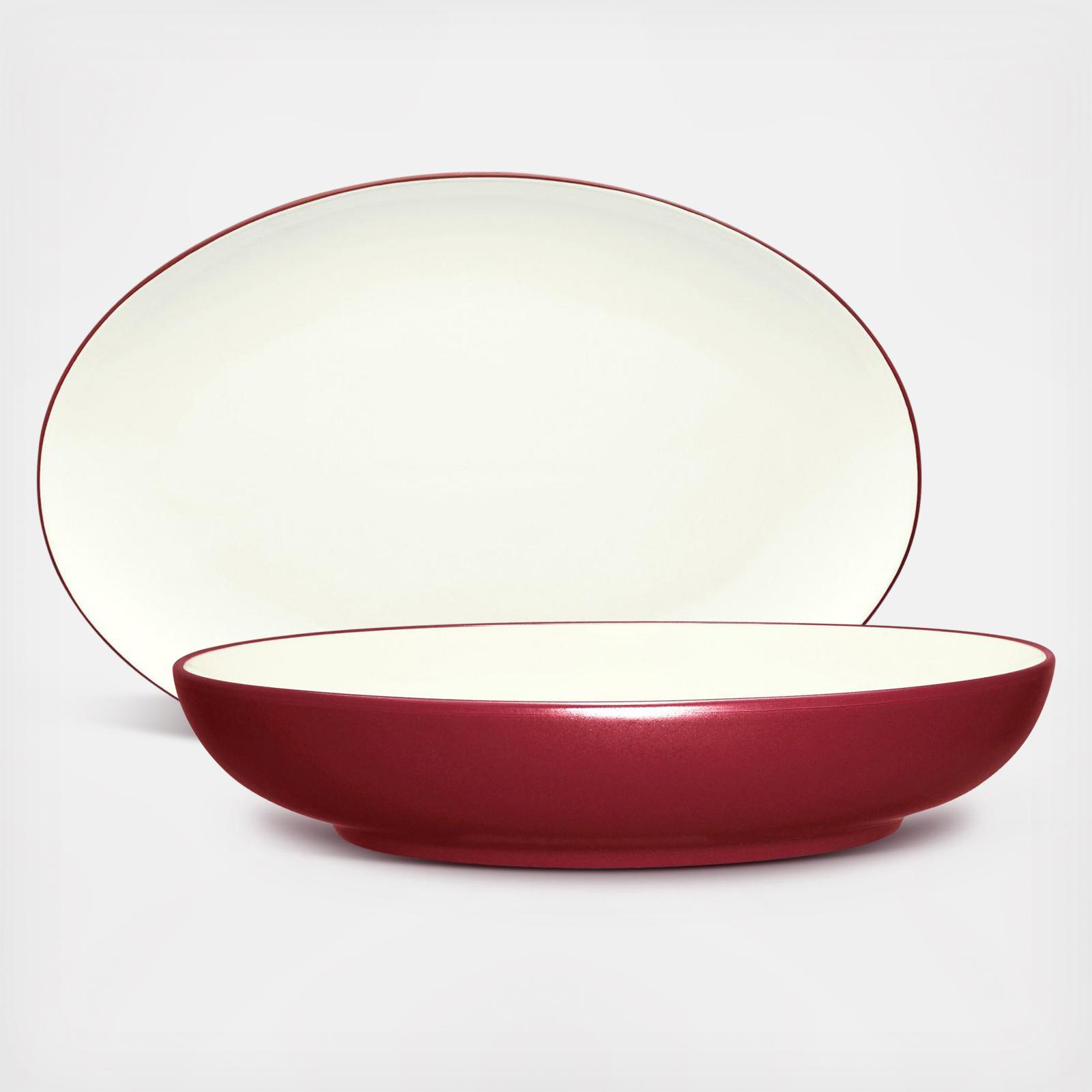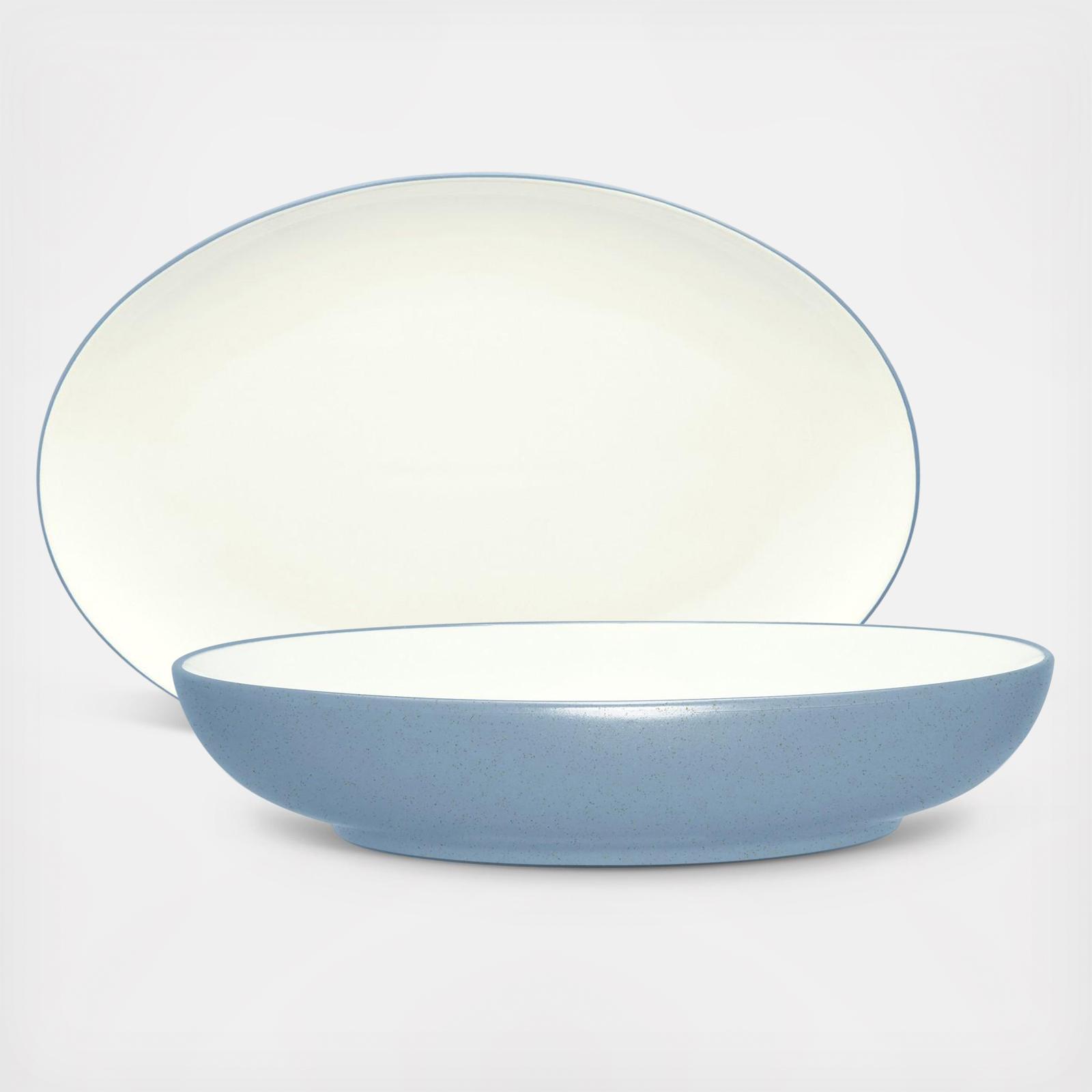The Colorwave collection has a matte-textured, earthy coloration on the outside and a glossy, cream-colored glaze on the inside. Mix and match the different shapes (available in coupe, rim, and square) and add a splash of color to your table. This serving bowl and oval platter is great for easy entertaining.