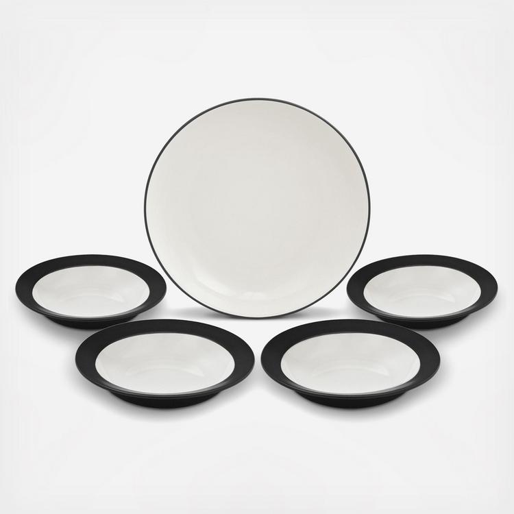 The Colorwave collection has a matte-textured, earthy coloration on the outside and a glossy, cream-colored glaze on the inside. Mix and match the different shapes (available in coupe, rim, and square) and add a splash of color to your table! The Colorwave collection is microwave, oven and dishwasher-safe. This set contains a Pasta Serving Bowl and 4 individual pasta bowls.