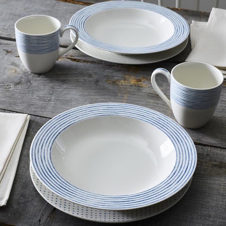A variety of motifs adorn Hammock Dinnerware in dishwasher-and-microwave-safe porcelain. Each piece incorporates dots, stripes or other patterns in different ways to give this distinctive casual dining collection a mix-and-match look as well as a fresh and modern appeal.