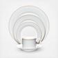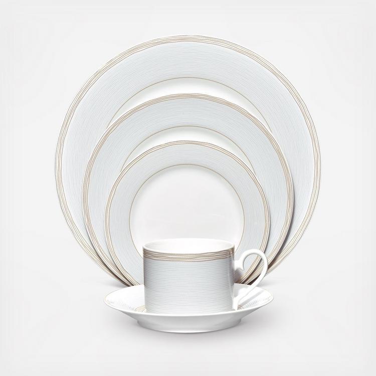 Linen Road was inspired by the texture of linen fabric. Here, the soft-feeling of the fabric is enhanced with bands of implied golden embroidery on white porcelain.