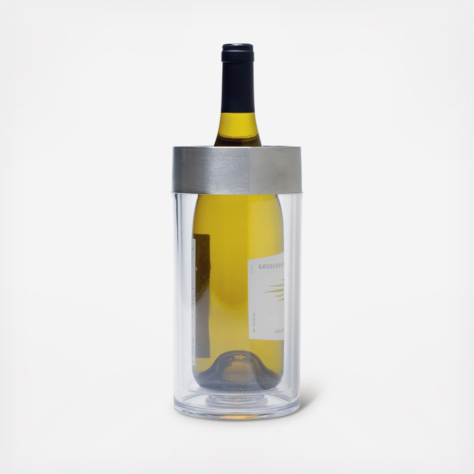 This Acrylic Chiller with Stainless Steel Rim is a no-freezing-required chilling option. It surrounds your bottle of wine with a double wall insulated, vacuum-sealed acrylic chamber, keeping the chill right where it should be: wrapped around your bottle.