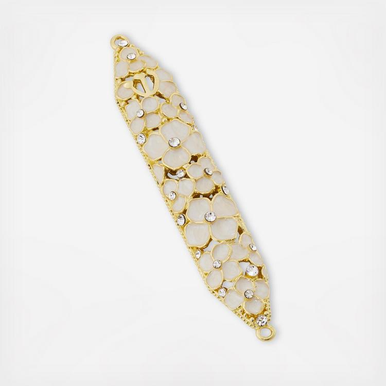 Delicate dogwood blossoms richly cast in gold-finished pewter, with intricate ivory-hued hand-enameling and hand-set clear European crystals